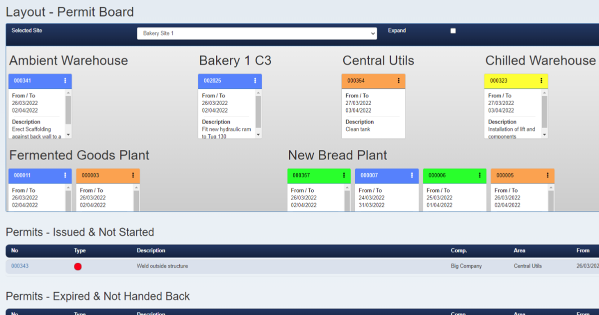A traditional permit board centralises storage and management of all paper based permits to work in force on a particular site. A paper-based board normally presents a series of wallets containing the actual permit or a copy, along with any LOTO tags. The board is prominently displayed and immediately alerts anyone entering that area, including contractors, to what work is being conducted, where and what the dangers are, any sanctions for test etc.