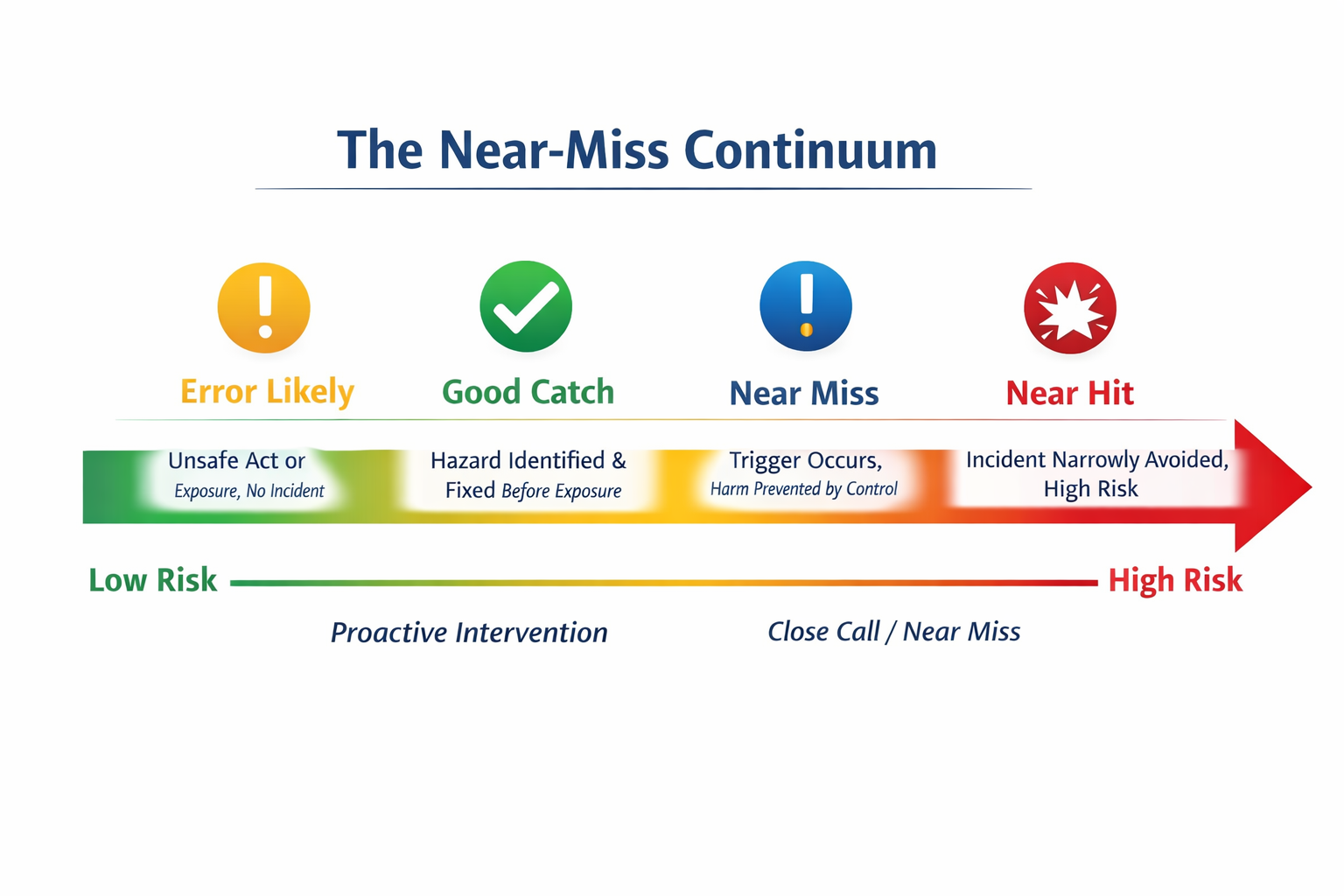 The near-miss continuum reflects how close an event came to causing harm and how much reliance there was on controls, timing or chance. Each category represents a different level of exposure and risk, and therefore requires a different type of response.