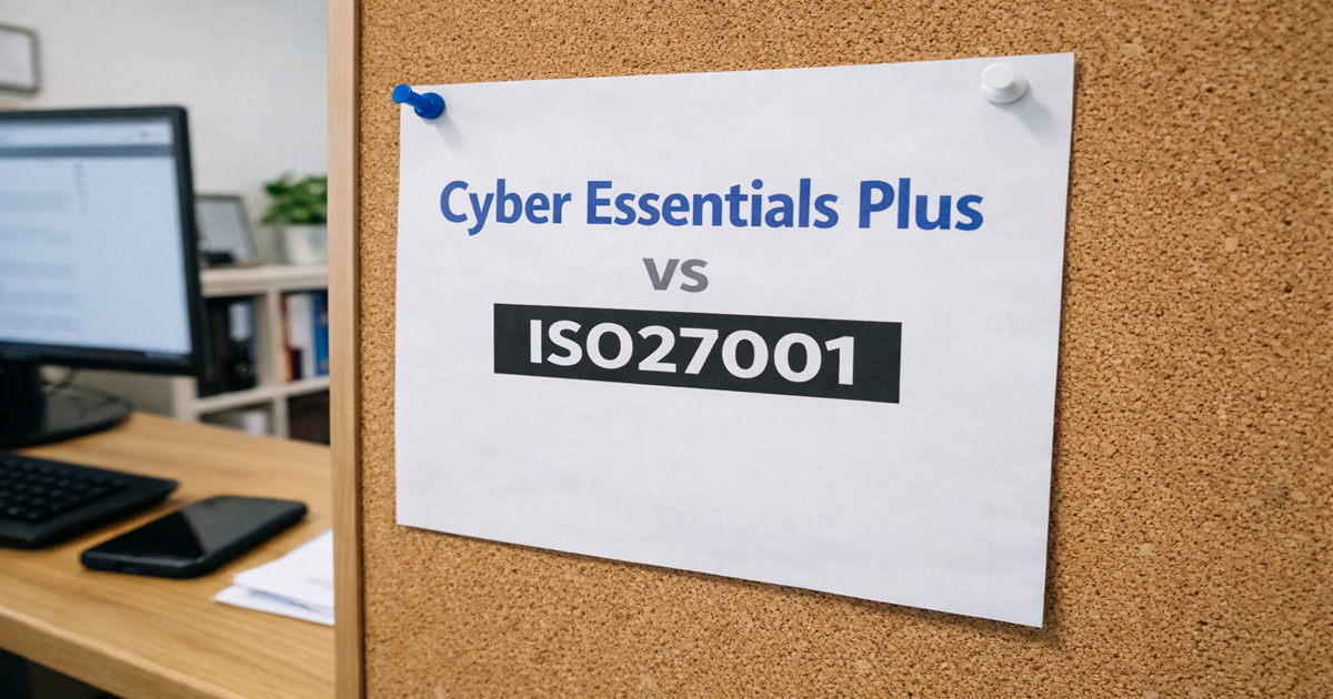 Cyber Essentials Plus demonstrates that essential technical controls are implemented and independently tested. ISO/IEC 27001 demonstrates that information security is governed through a formal, risk-based management system with continuous improvement.